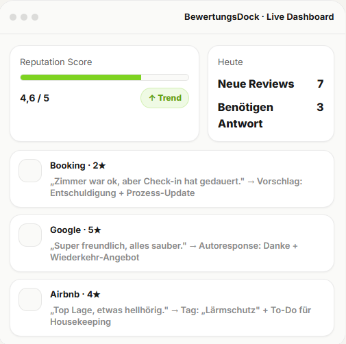 Ferienwohnungen/Hotels, Dienstleister, Agenturen – überall dort, wo Reputation Umsatz ist und Reaktionszeit zählt. Wenn du sagst „wir machen das später", ist die Wahrheit: du zahlst mit Buchungen.